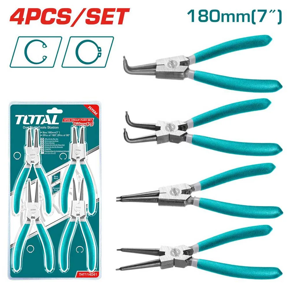 Bộ 4 Kềm Mở Phe 7 Inch Total THT114041 còn gọi là kềm phanh hoặc kìm gắp phe, là một bộ dụng cụ cơ khí chuyên dụng dùng để tháo và lắp các loại vòng phe (vòng phanh). Các vòng phe này được sử dụng để cố định các chi tiết máy trong các động cơ, linh kiện điện tử, và máy móc công nghiệp.