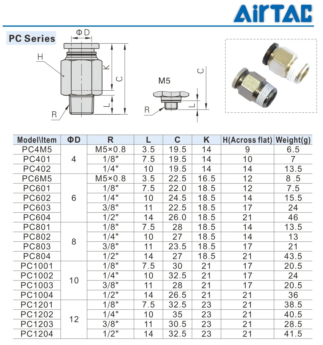 Đầu Nối Ren Ngoài Khí Nén AirTac PC601 thường được ký hiệu là PC (Male Connector), là một loại phụ kiện khí nén có chức năng kết nối một đầu ống dẫn khí với một thiết bị, van, hoặc bộ lọc có ren trong, trên một đường thẳng. Sử dụng rộng rãi trong các hệ thống khí nén công nghiệp, máy móc tự động hóa, nơi cần sự linh hoạt trong việc đi dây và điều chỉnh lưu lượng khí giữa các bộ phận khác nhau.