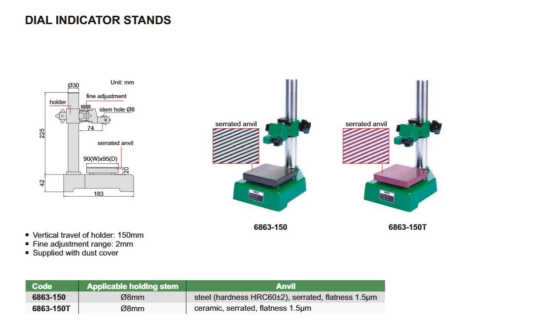 Đế Gá Đồng Hồ So Insize 6863-150 là một công cụ không thể thiếu trong các ngành công nghiệp cơ khí, chế tạo và sửa chữa. Sản phẩm được thiết kế để giữ cố định đồng hồ so, giúp người dùng dễ dàng thực hiện các phép đo chính xác và ổn định. Với chiều cao trụ 225mm và đường kính trụ ø30mm, đế gá này phù hợp với nhiều loại đồng hồ so khác nhau. Đặc biệt, đế gá được trang bị mặt đá granite với độ phẳng 1.5µm, đảm bảo bề mặt làm việc luôn phẳng và ổn định, giảm thiểu sai số trong quá trình đo. Kích thước chân đế 183x150x42mm tạo sự vững chắc, không bị rung lắc khi sử dụng. Sản phẩm được sản xuất tại Nhật Bản, đảm bảo chất lượng và độ bền vượt trội, đáp ứng mọi yêu cầu khắt khe của người dùng chuyên nghiệp.
