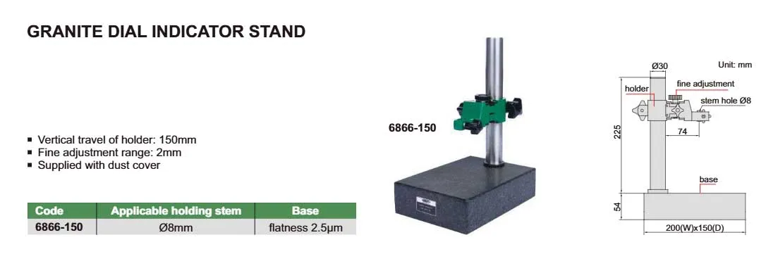 Đế Gá Đồng Hồ So Insize 6866-150 là một công cụ không thể thiếu trong các ngành công nghiệp cơ khí, chế tạo và sửa chữa. Sản phẩm được thiết kế để giữ cố định đồng hồ so, giúp người dùng dễ dàng thực hiện các phép đo chính xác và ổn định. Với chiều cao trụ 225mm và đường kính trụ ø30mm, đế gá này phù hợp với nhiều loại đồng hồ so khác nhau. Đặc biệt, đế gá được trang bị mặt đá granite với độ phẳng 2.5µm, đảm bảo bề mặt làm việc luôn phẳng và ổn định, giảm thiểu sai số trong quá trình đo. Kích thước chân đế 200x150x54mm tạo sự vững chắc, không bị rung lắc khi sử dụng. Sản phẩm được sản xuất tại Nhật Bản, đảm bảo chất lượng và độ bền vượt trội, đáp ứng mọi yêu cầu khắt khe của người dùng chuyên nghiệp.