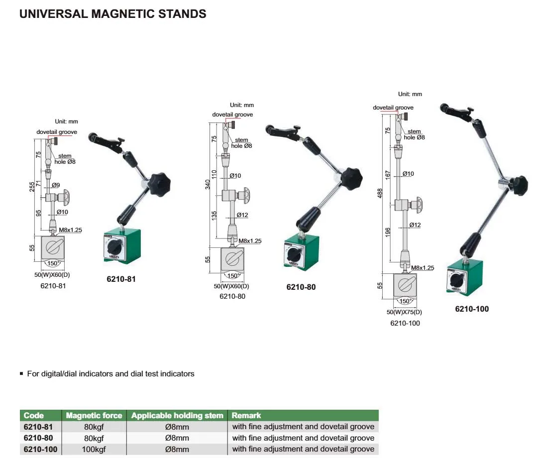 - Dành cho đồng hồ so điện tử, đồng hồ so cơ khí và đồng hồ so chân gập cơ khí