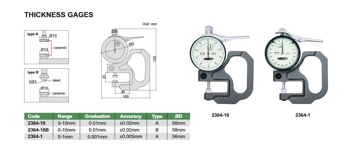 Đồng Hồ Đo Độ Dày Insize 2364-10 (0-10 mm) còn được gọi là thước đo độ dày hoặc thiết bị đo độ dày, là một dụng cụ được dùng để đo chiều dày của các vật liệu như kim loại, nhựa, cao su, giấy, thủy tinh, màng mỏng, và nhiều loại vật liệu khác.