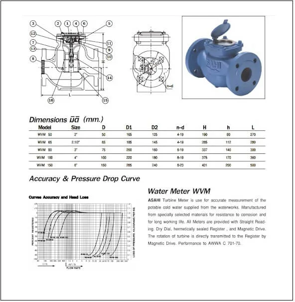 Đồng Hồ Nước Asahi WVM 65 là một thiết bị đo lưu lượng nước lạnh dạng cơ, sử dụng công nghệ tuabin kiểu Woltman, mặt khô (dry-dial), được sản xuất tại Thái Lan theo tiêu chuẩn công nghệ Nhật Bản. Đây là dòng đồng hồ cỡ lớn, được thiết kế cho các ứng dụng công nghiệp, thương mại hoặc các hệ thống cấp nước trục chính với đường ống có kích thước DN65 (phi 76mm, 2 1/2 inch).