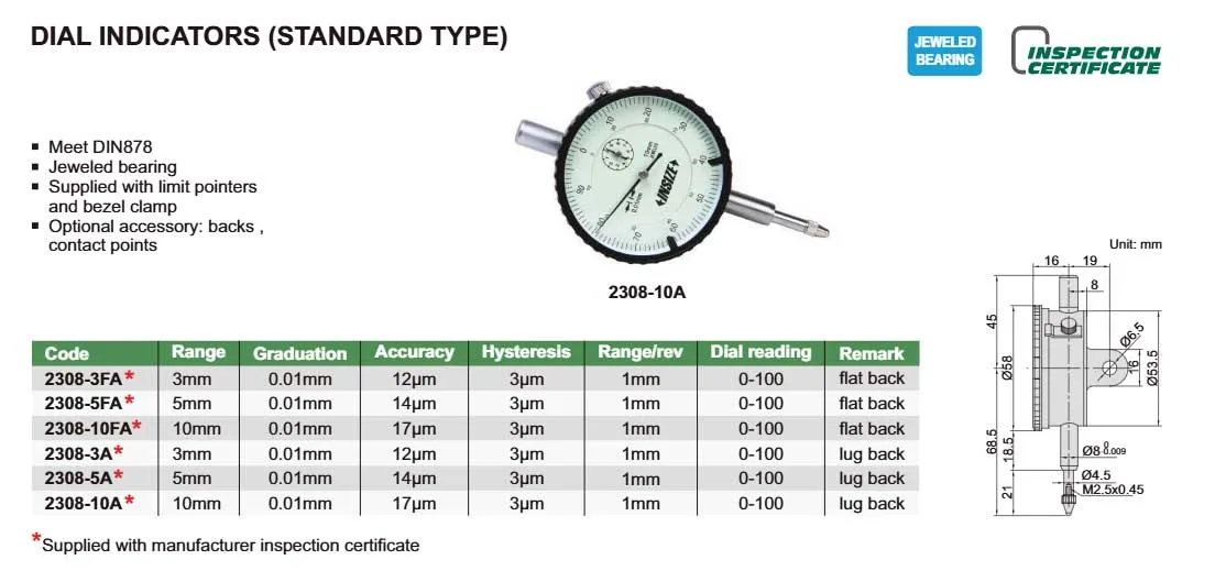 Đồng Hồ So Cơ Khí Insize 2308-10FA (0-10mm) (tên tiếng Anh là dial gauge) là dụng cụ dùng để đo độ sai lệch về hình học, hình dạng và vị trí của các chi tiết so với một chuẩn ban đầu, độ chính xác cao. Dụng cụ này được ứng dụng rộng rãi trong ngành cơ khí và chế tạo máy.