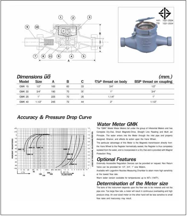 Đồng Hồ Từ Asahi GMK 15 ID là mẫu đồng hồ đo lưu lượng nước sạch, thân ren, kiểu đa tia (multi-jet), truyền động từ tính, được sản xuất tại Thái Lan theo tiêu chuẩn công nghệ Nhật Bản. Đây là thiết bị chuyên dụng cho lắp đặt theo phương ngang (horizontal installation) trong hệ thống nước sinh hoạt gia đình, có kích thước DN15 (phi 21mm, 1/2 inch).