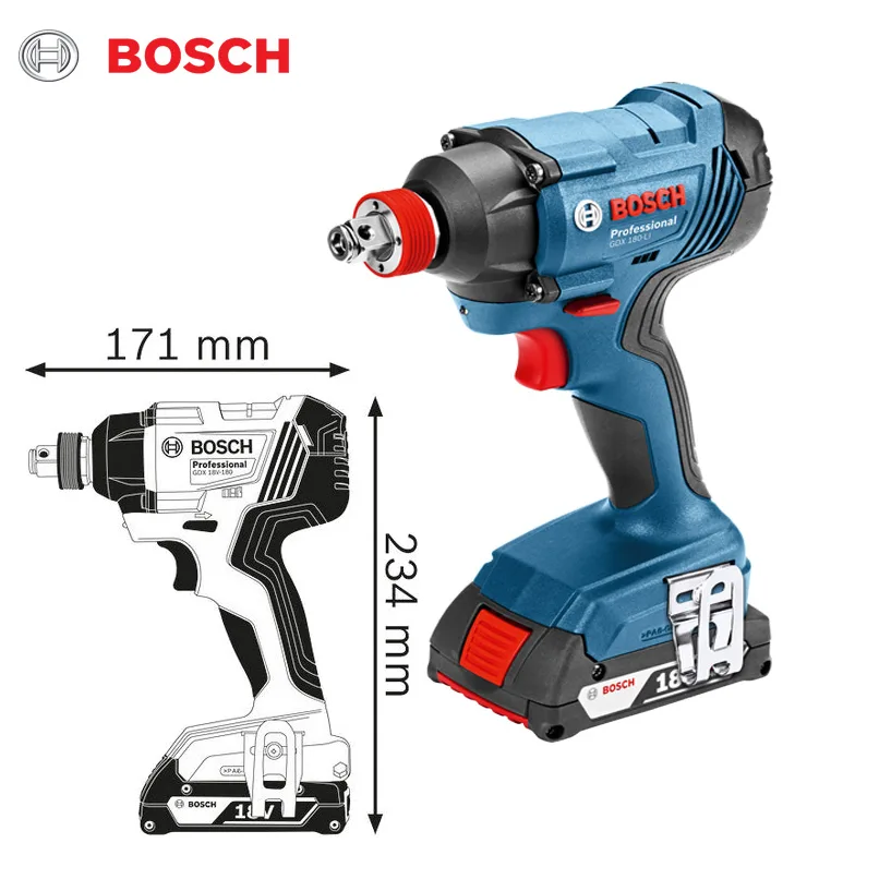 Máy Siết Bu Lông Dùng Pin Bosch GDX 180-LI là một trong những sản phẩm nổi bật của Bosch, được thiết kế để đáp ứng nhu cầu siết và tháo bu lông, ốc vít trong nhiều ứng dụng khác nhau. Với động cơ mạnh mẽ, GDX 180-LI có thể tạo ra lực xoắn lên đến 180Nm, giúp bạn dễ dàng xử lý các loại bu lông cứng đầu . Thiết kế đầu kẹp đa năng 2 trong 1 (1/4″ lục giác và 1/2″ cạnh vuông) cho phép bạn sử dụng nhiều loại đầu vít khác nhau, tăng tính linh hoạt và tiện dụng. Bên cạnh đó, máy còn được trang bị đèn LED chiếu sáng, giúp bạn làm việc dễ dàng hơn trong điều kiện thiếu sáng. Với trọng lượng chỉ 1.5kg (khi lắp pin 2.0Ah), GDX 180-LI rất nhẹ và dễ dàng thao tác trong thời gian dài mà không gây mỏi tay. Vỏ máy được làm từ vật liệu cao cấp, chịu va đập tốt, đảm bảo độ bền và tuổi thọ của sản phẩm. Đây thực sự là một công cụ lý tưởng cho cả thợ chuyên nghiệp và người dùng gia đình.