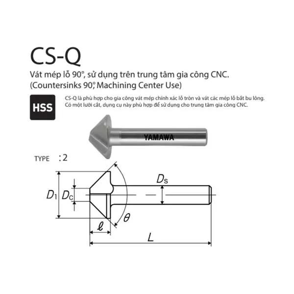Mũi Vát Mép Yamawa CS-Q 15x90x10 CS015Q là mũi vát mép lỗ của hãng Yamawa (Nhật Bản), được thiết kế chuyên dụng để xử lý vát các lỗ tròn và các mặt phẳng gắn bu lông, ốc vít, cho độ chính xác cao trong gia công cơ khí, đặc biệt phù hợp với trung tâm gia công.