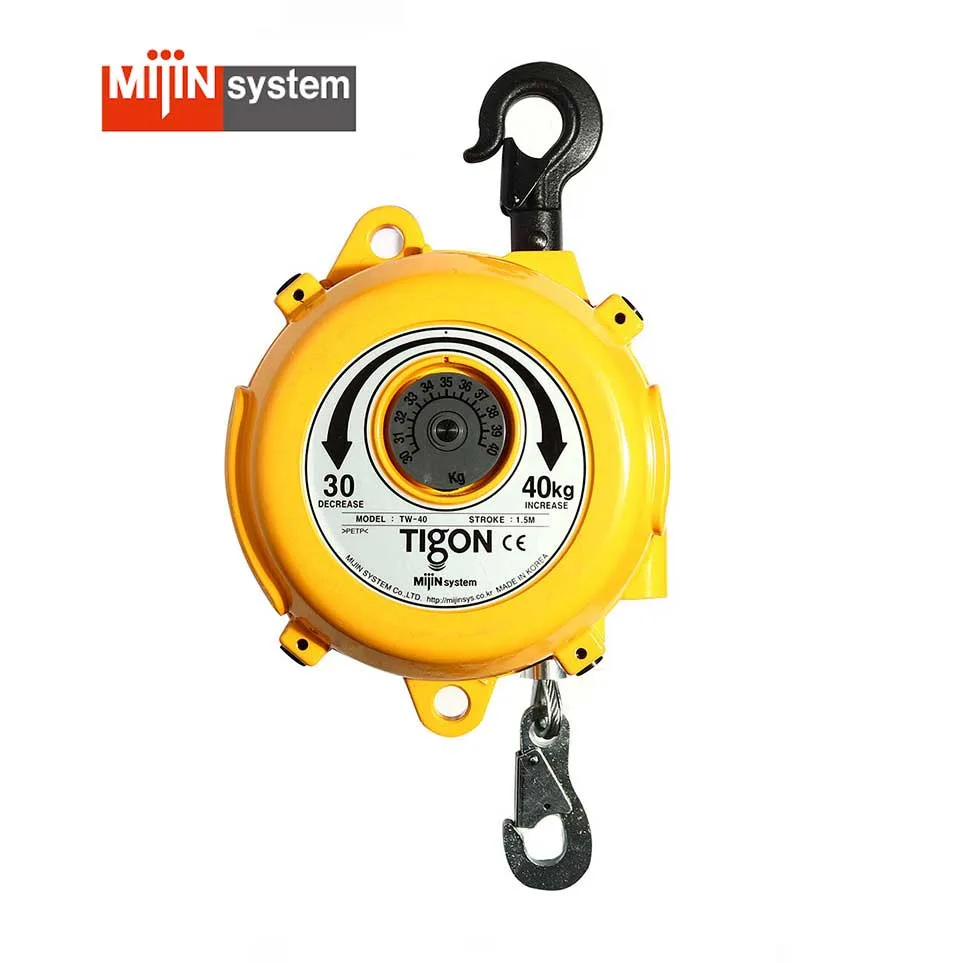 Pa Lăng Cân Bằng Tigon TW-40 (còn gọi là palăng lò xo tự rút) là thiết bị hỗ trợ treo và nâng hạ dụng cụ, vật nặng trong sản xuất công nghiệp. Thiết bị này sử dụng hệ thống lò xo tự động kéo căng khi treo vật nặng, làm giảm gần như trọng lượng thực tế của vật, giúp người vận hành dễ dàng kiểm soát vị trí và di chuyển mà không tốn nhiều sức lực.