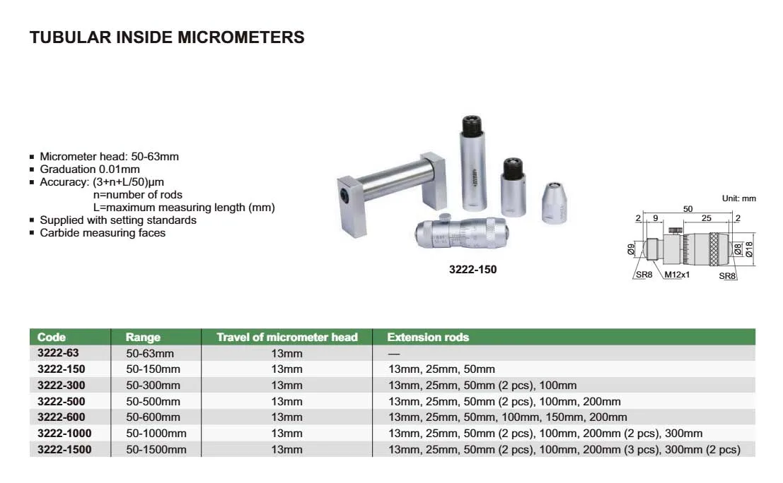 Panme Cơ Khí Đo Trong Insize 3222-300 (50-300 mm) là một công cụ đo lường chuyên dụng, được thiết kế để đo đường kính bên trong của các vật thể một cách chính xác. Sản phẩm này đặc biệt hữu ích trong các ngành công nghiệp chế tạo, cơ khí, và xây dựng, nơi mà độ chính xác cao là yếu tố then chốt. Với phạm vi đo từ 50-300 mm, panme này phù hợp để đo nhiều loại kích thước khác nhau.