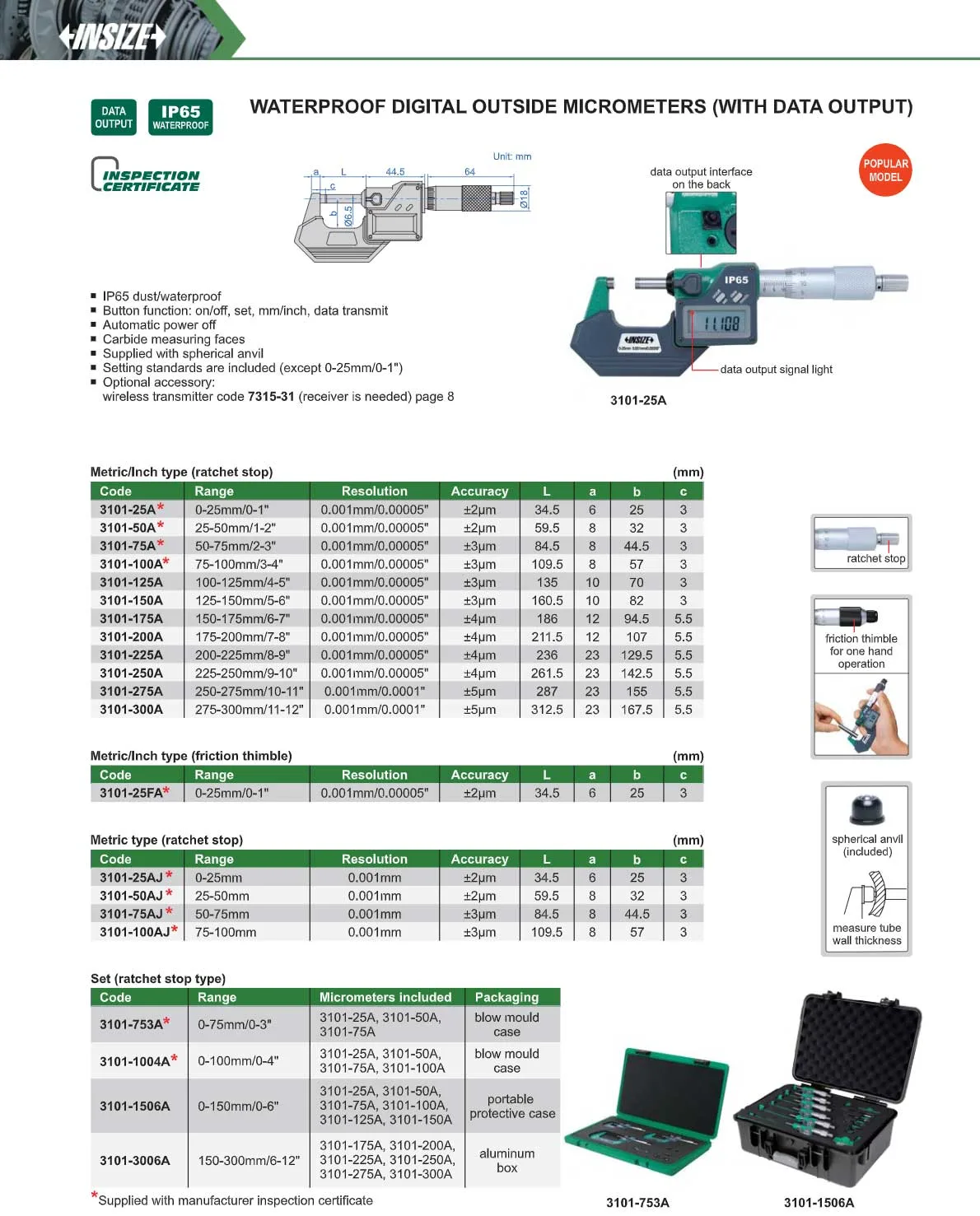 Panme Điện Tử Đo Ngoài Insize 3101-50AJ (25-50 mm) là một loại dụng cụ đo lường cơ khí chính xác sử dụng trong công nghiệp. Thước panme được sử dụng để đo các chi tiết hình trụ, hình ống, hình lỗ… với độ chính xác cao. Các phép đo bằng Micromet cho kết quả chính xác hơn nhiều so với thước cặp