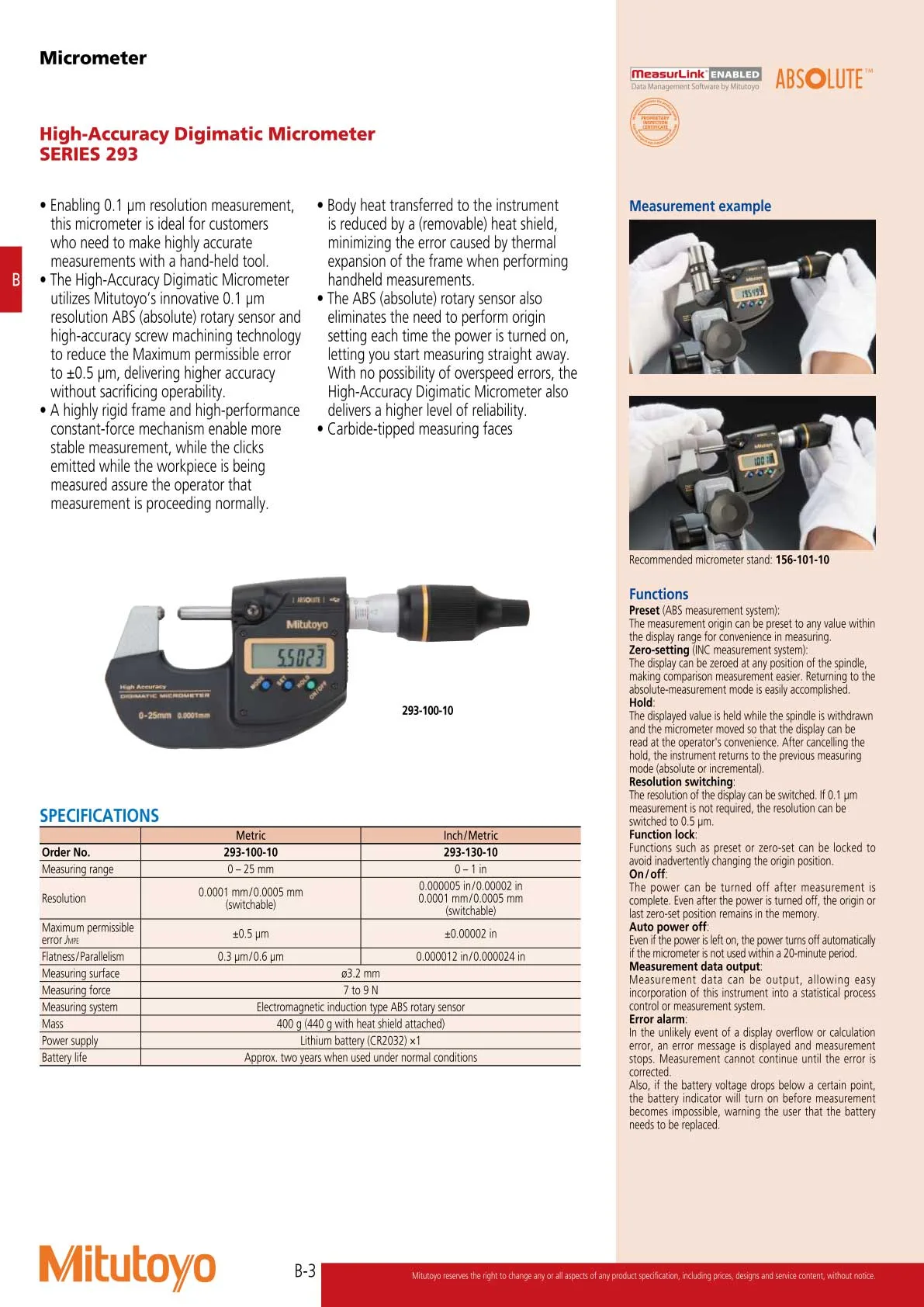 Được sản xuất tại Nhật Bản, panme điện tử Mitutoyo 293-100-10 thừa hưởng những tiêu chuẩn chất lượng khắt khe nhất, đảm bảo độ bền và tuổi thọ cao. Thiết kế thân thiện với người dùng giúp bạn dễ dàng thao tác và đọc kết quả, ngay cả trong điều kiện làm việc khó khăn. Ngoài ra, panme còn được trang bị cổng SPC, cho phép kết nối với các thiết bị ngoại vi để thu thập và phân tích dữ liệu một cách thuận tiện.