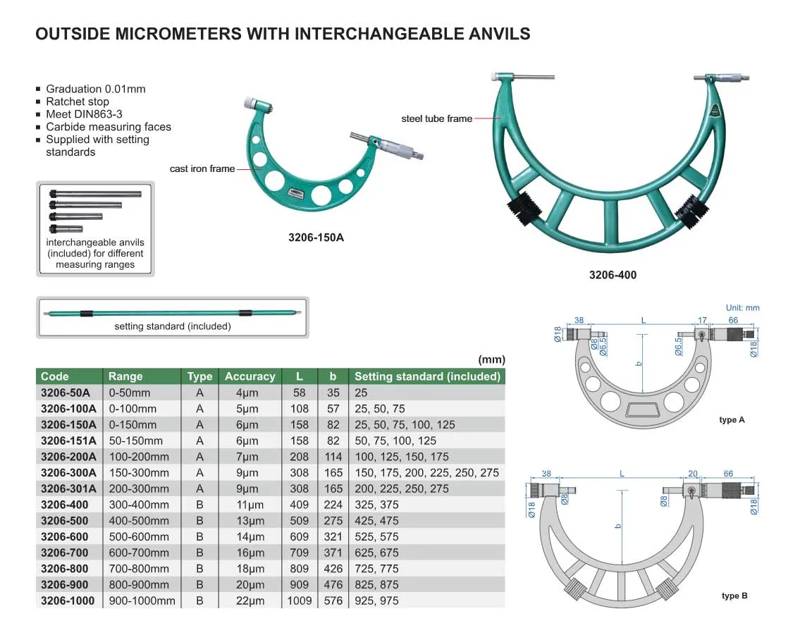 Panme Đo Ngoài Insize 3206-300A (150-300mm) là một thiết bị đo lường chính xác cao, được thiết kế để đo đường kính ngoài của các vật thể. Với phạm vi đo từ 150-300mm, sản phẩm này phù hợp cho nhiều ứng dụng khác nhau, từ công việc gia công cơ khí chính xác đến kiểm tra chất lượng sản phẩm.