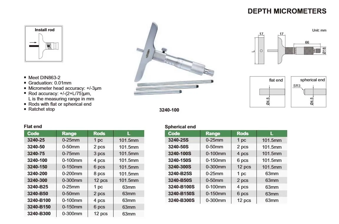 Panme Đo Sâu Cơ Khí Insize 3240-200 (0-200 mm) là dụng cụ dùng để đo độ sâu của lỗ hoặc rãnh trong gia công cơ khí, sản xuất, sửa chữa, ô tô, thiết bị cơ khí. Dòng sản phẩm này có ưu điểm là giá phải chăng, bền bỉ (thường làm bằng thép không gỉ, chống mài mòn, oxy hóa) và hoạt động không cần nguồn điện, thích hợp với môi trường có dầu hoặc từ trường.