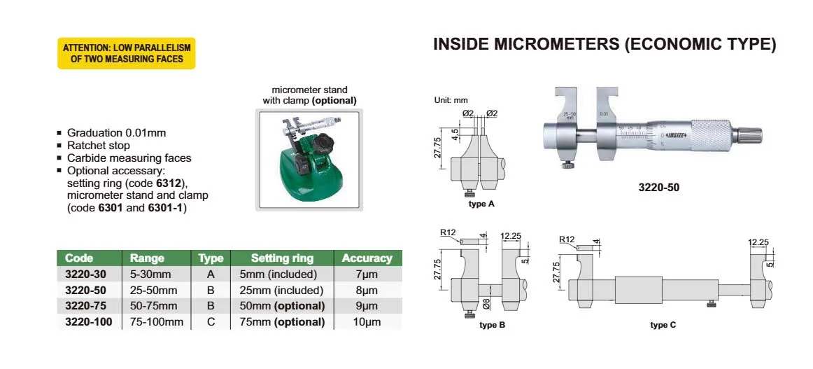 Panme Đo Trong Insize 3220-30 (5-30mm) là một công cụ đo lường chuyên dụng, được thiết kế để đo đường kính bên trong của các vật thể một cách chính xác. Sản phẩm này đặc biệt hữu ích trong các ngành công nghiệp chế tạo, cơ khí, và xây dựng, nơi mà độ chính xác cao là yếu tố then chốt. Với phạm vi đo từ 5-30mm, panme này phù hợp để đo nhiều loại kích thước khác nhau.
