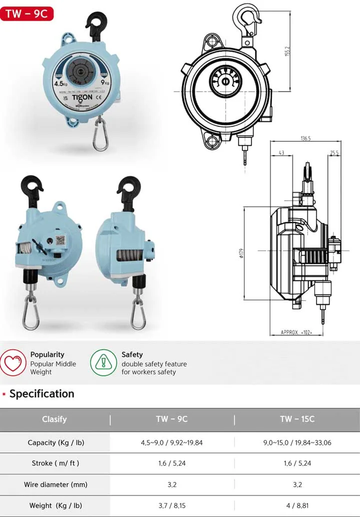 Ròng Rọc Cân Bằng Tigon TW-9C hay còn gọi là pa lăng cân bằng, là thiết bị dùng để hỗ trợ nâng hạ vật nặng, giúp người vận hành thao tác dễ dàng hơn nhờ một hệ thống đàn hồi (thường là lò xo) bên trong giúp giảm tải trọng của vật. Thiết bị này được ứng dụng rộng rãi trong các dây chuyền sản xuất để treo các dụng cụ, thiết bị, giúp giảm mỏi tay và nâng cao hiệu quả công việc mà không cần sử dụng điện năng hay khí nén.