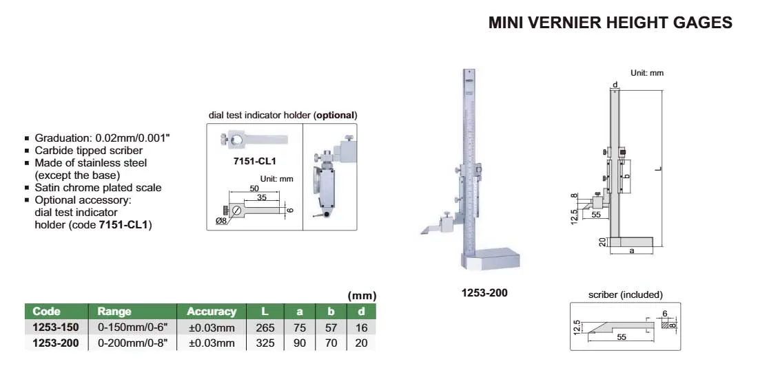 Thước Đo Cao Cơ Khí Insize 1253-200 (0-200mm/0-8″) là một dụng cụ đo lường chính xác, dùng để đo chiều cao, xác định vị trí lỗ, vạch dấu trên chi tiết cơ khí. Thiết bị này hoạt động dựa trên cơ chế cơ khí truyền thống, bao gồm thang đo chính và thang đo du xích để cho kết quả đo độ chính xác cao mà không cần nguồn điện. Thước được đặt trên một mặt phẳng để thực hiện phép đo theo hướng thẳng đứng từ trên xuống.