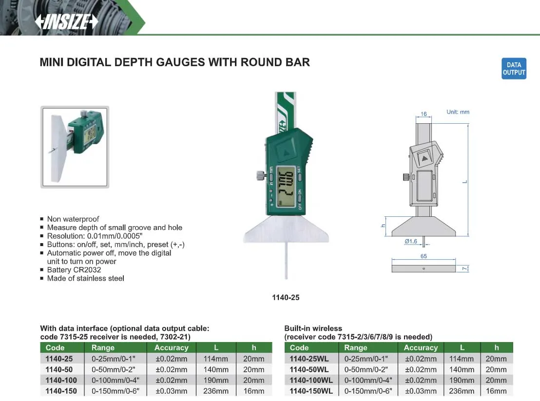 Thước Đo Sâu Điện Tử Insize 1140-25 (0-25 mm/0-1″) là dụng cụ đo lường chính xác dùng để đo độ sâu của rãnh, lỗ hoặc bậc trong các chi tiết kỹ thuật. Nó sử dụng công nghệ điện tử để hiển thị kết quả đo trên màn hình LCD, thay vì phương pháp cơ học truyền thống, giúp đo lường nhanh chóng và có độ chính xác cao. Thước này thường được sử dụng trong các ngành như cơ khí, chế tạo máy, xây dựng và nội thất.