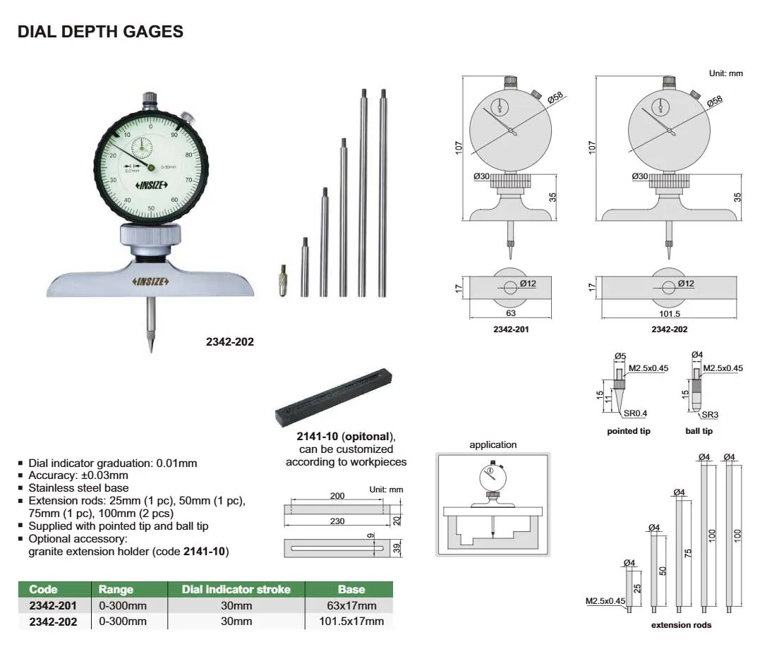 Thước Đo Sâu Đồng Hồ Insize 2342-202 (0-300 mm) là dụng cụ đo lường cơ khí dùng để đo độ sâu của rãnh, lỗ, bậc trên các chi tiết với độ chính xác cao, được hiển thị kết quả qua mặt đồng hồ so. Dụng cụ này thường được sử dụng trong các ngành cơ khí, xây dựng, khuôn mẫu, và chế tạo.