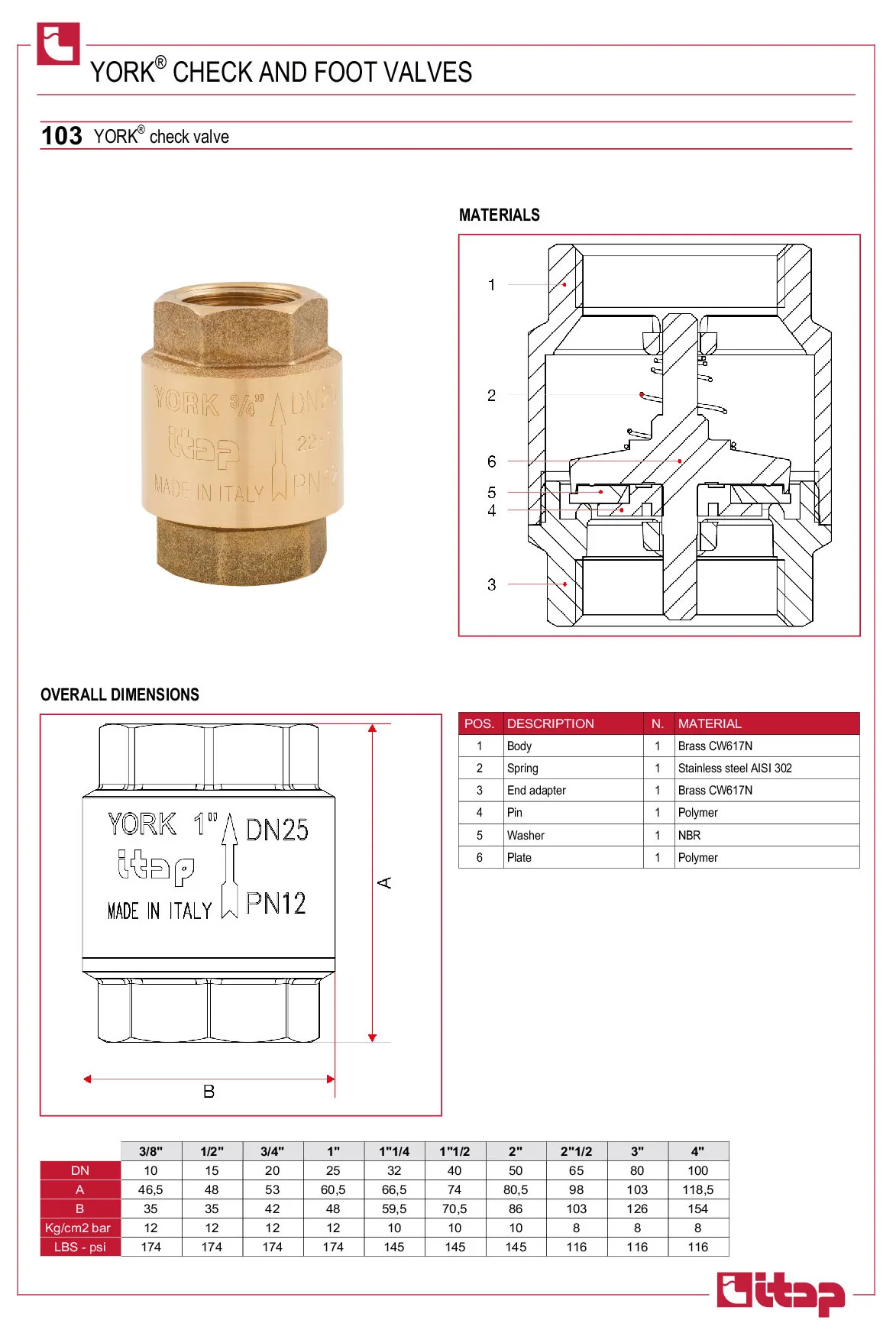 Van Một Chiều Itap.103 YORK® (hay còn gọi tắt là Itap 103) là một dòng sản phẩm van một chiều lò xo (spring check valve) bằng đồng thau được sản xuất bởi ITAP, Ý. Chức năng chính của van ITAP.103 là cho phép dòng chảy của lưu chất (nước, khí nén, dầu, v.v.) đi qua theo một hướng nhất định và tự động đóng lại để ngăn chặn hoàn toàn dòng chảy ngược, bảo vệ hệ thống và các thiết bị như máy bơm.