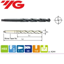 Mũi Khoan Chuôi Côn D17 YG1 D1201 là dòng mũi khoan thép gió (HSS) chất lượng cao của thương hiệu Hàn Quốc YG-1, được thiết kế để khoan các vật liệu như thép, gang, nhôm và đồng. Mũi khoan YG-1 được sử dụng rộng rãi trong gia công cơ khí để khoan các loại vật liệu khác nhau, bao gồm: thép đúc hợp kim và không hợp kim; gang xám, gang đúc; Graphit; Sắt; Nhôm; Đồng